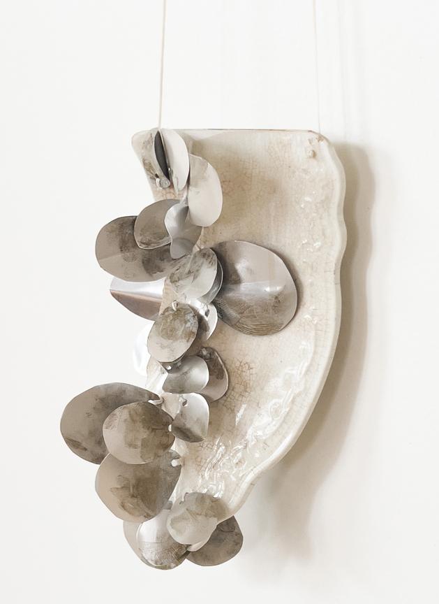 "can do" , antique plate porcelain shard, cider can teardrops, linen & waxed cord